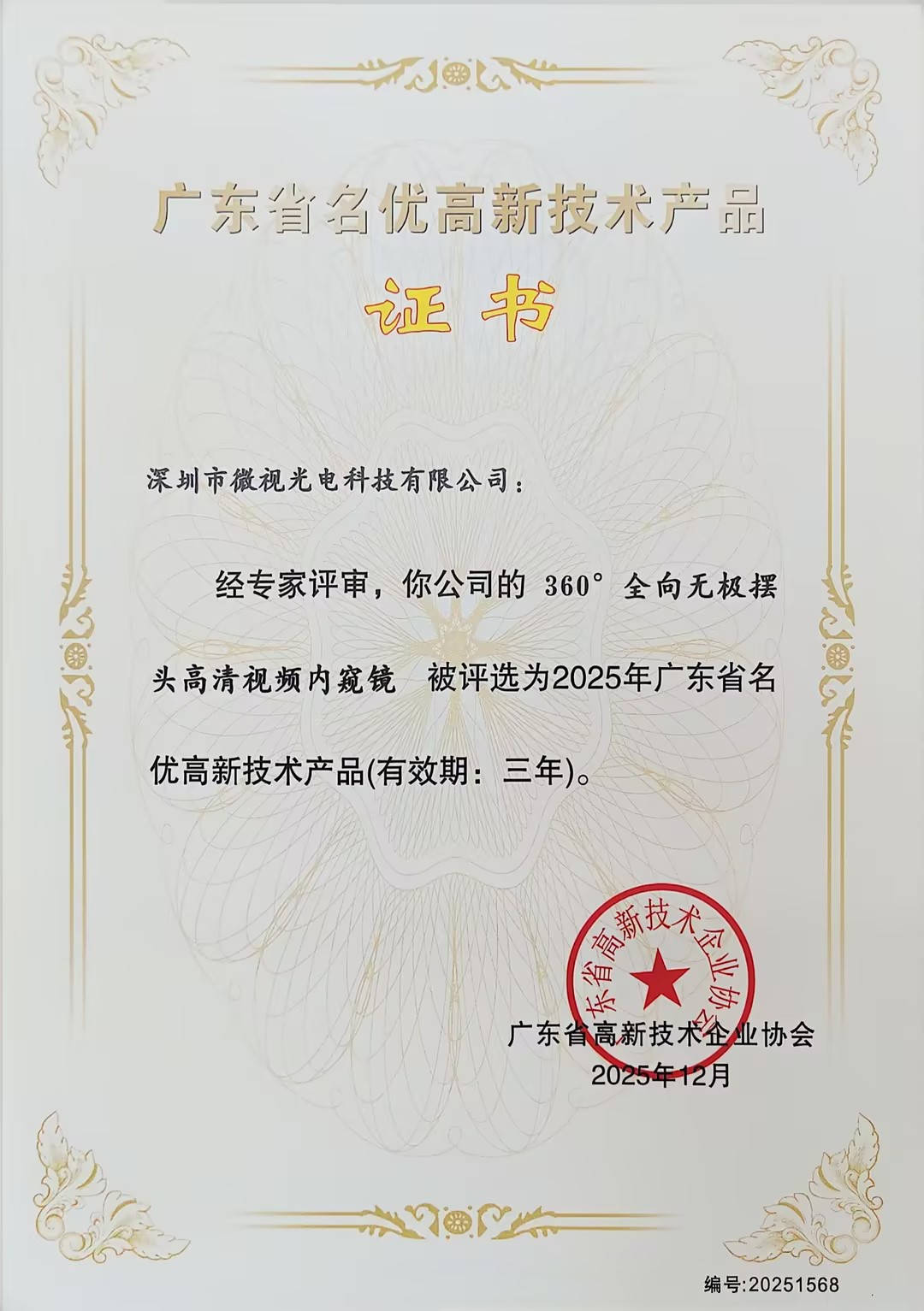 近日,深圳微视三款创新产品:耐高温智控冷旋内窥镜、0.95mm超细工业级探视镜以及360°全向无极摆头高清视频内窥镜,均荣获“2025年广东省名优高新技术产品”称号。这一认证不仅是对微视光电技术实力的高度认可,也标志着公司在高新技术领域的又一重大突破。