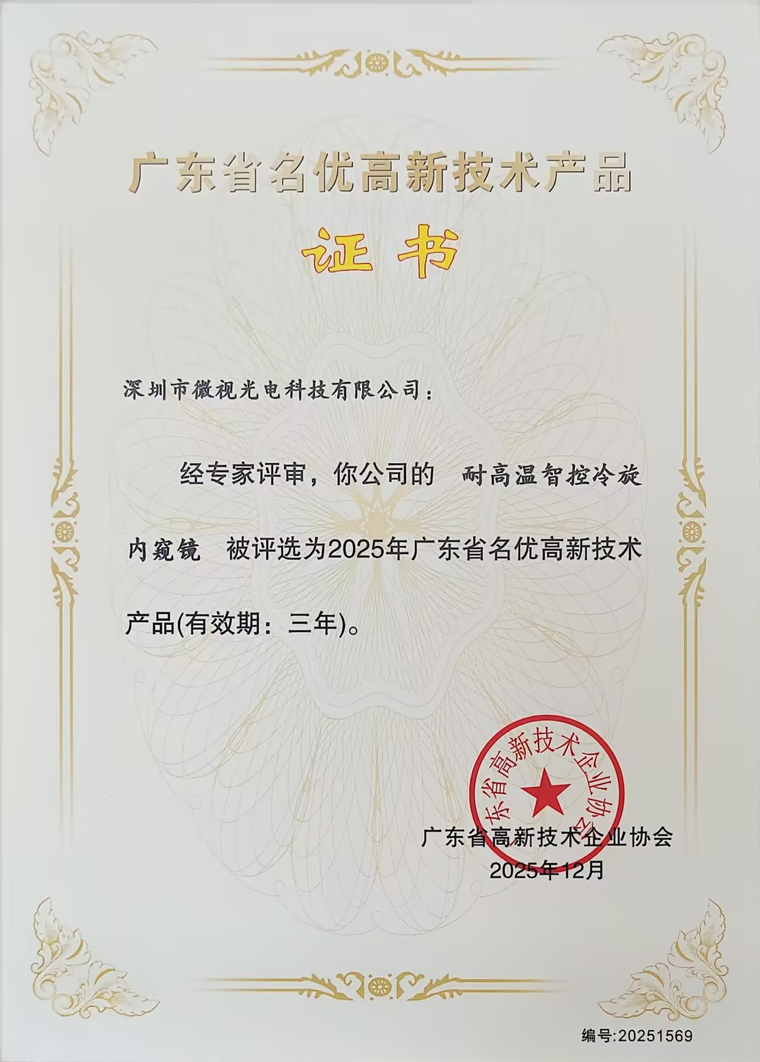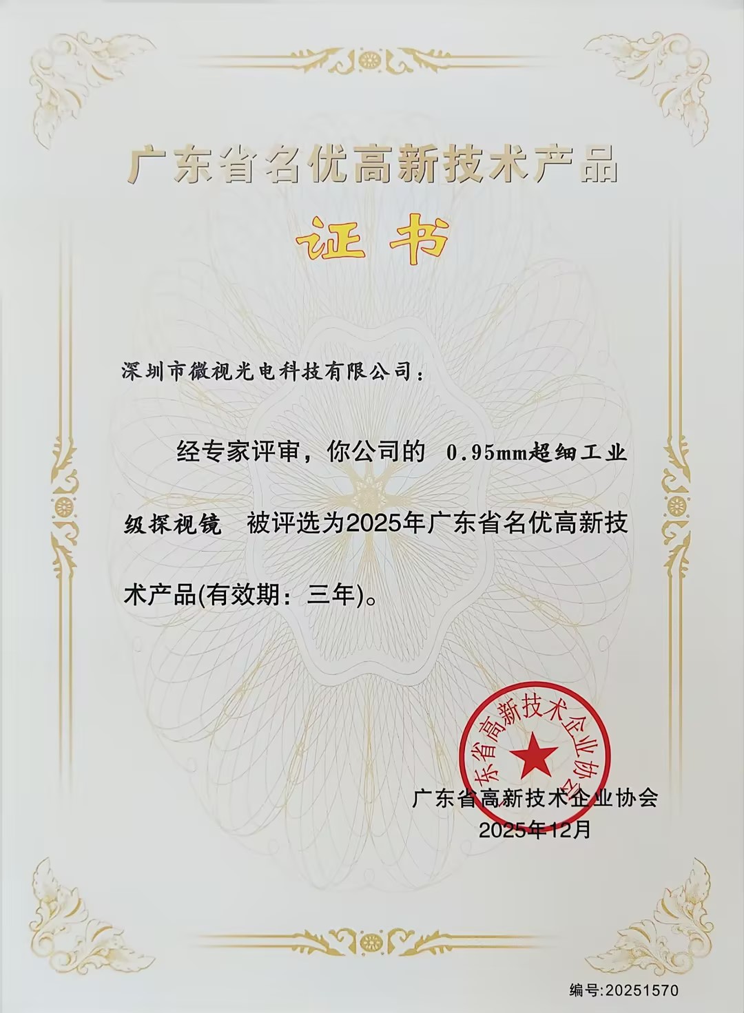 近日,深圳微视三款创新产品:耐高温智控冷旋内窥镜、0.95mm超细工业级探视镜以及360°全向无极摆头高清视频内窥镜,均荣获“2025年广东省名优高新技术产品”称号。这一认证不仅是对微视光电技术实力的高度认可,也标志着公司在高新技术领域的又一重大突破。