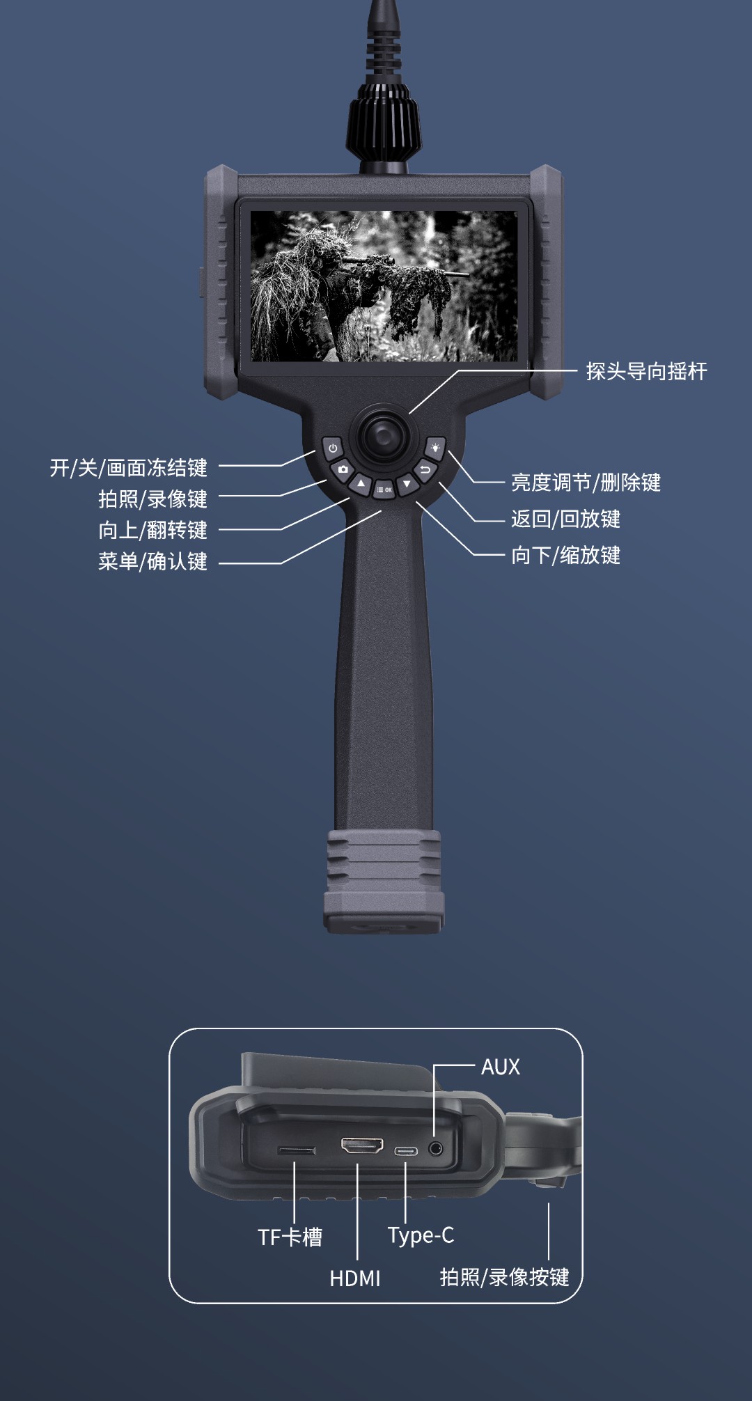 优势特点:红白双光源;6英寸大屏;双电路设计,单节电池也能工作;360°旋转探头
